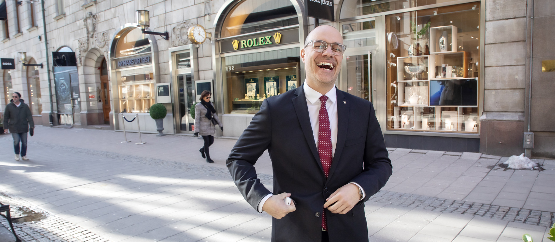 Mårten outside the Stockholm boutique, Nymans Ur 1851, located on Biblioteksgatan in the city center.
