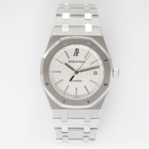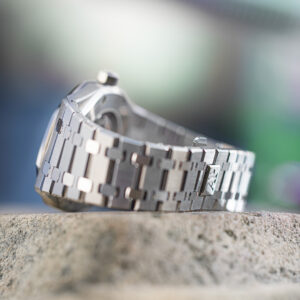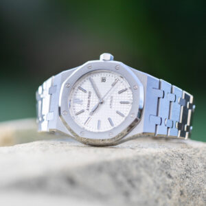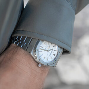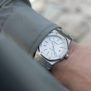 This model is particularly striking for its fresh and radiant light hue on the white dial, which adds a vibrant and eye-catching quality. The dial, true to Royal Oak’s heritage, showcases the signature tapisserie pattern, lume-filled hands, and indexes. The AP logo replaces the 12 o’clock index. Additionally, this model features a practical date window at 3 o’clock and a center seconds hand.