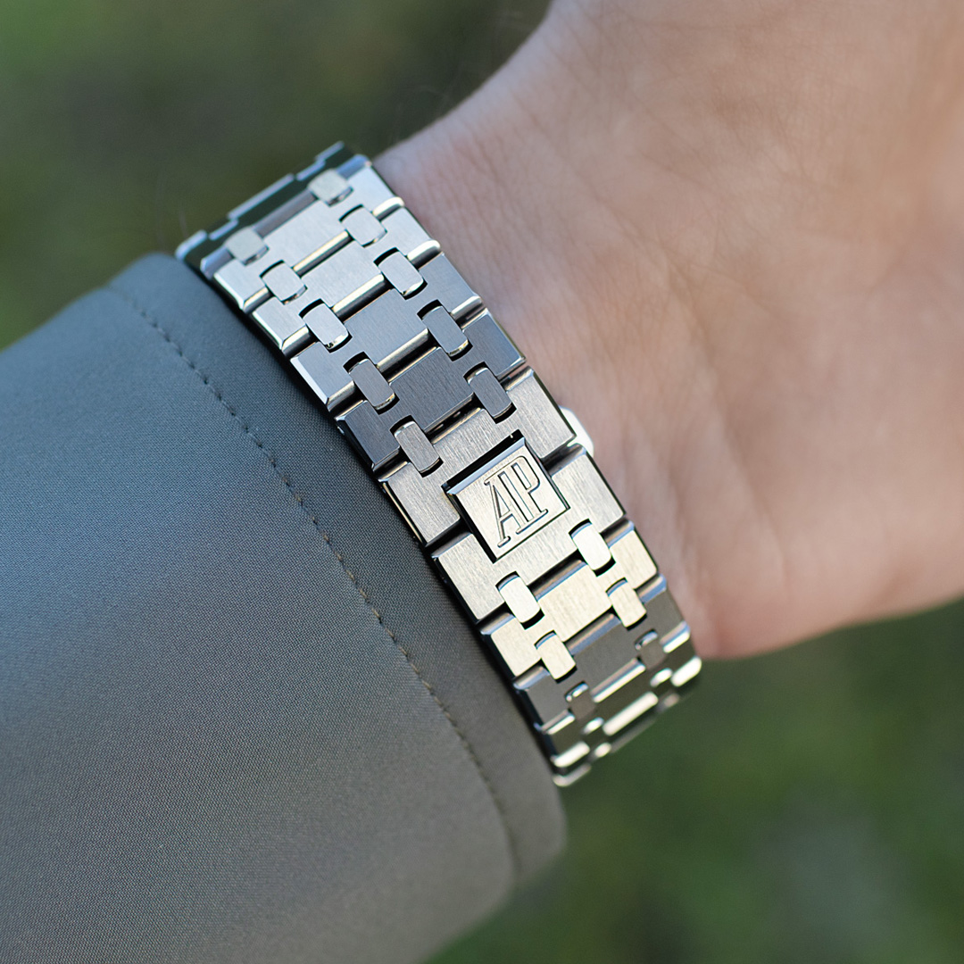 Bracelet: Audemars Piguet stainless steel integrated bracelet.