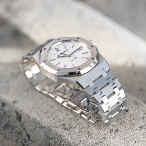 This Audemars Piguet 15300, featuring a striking white dial, stands as a spectacular example of fine watchmaking, in an exceptional mint condition. The watch is entirely free from scratches, dings, or any signs of wear, a testament to its careful storage and maintenance. The sharp, knife-edge precision of every contour on this prestigious timepiece highlights Audemars Piguet’s uncompromising craftsmanship and attention to detail.