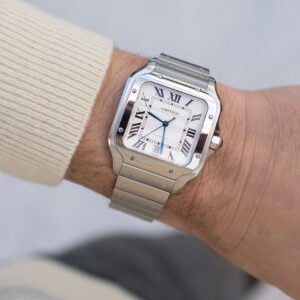 This Santos de Cartier is in excellent condition, with minor signs of wear consistent with careful use. The bracelet and case remain sharp, with no deep scratches or dings. The watch’s versatile design makes it a perfect choice for both casual and formal occasions.