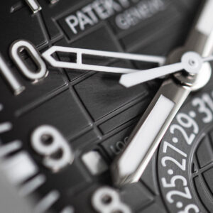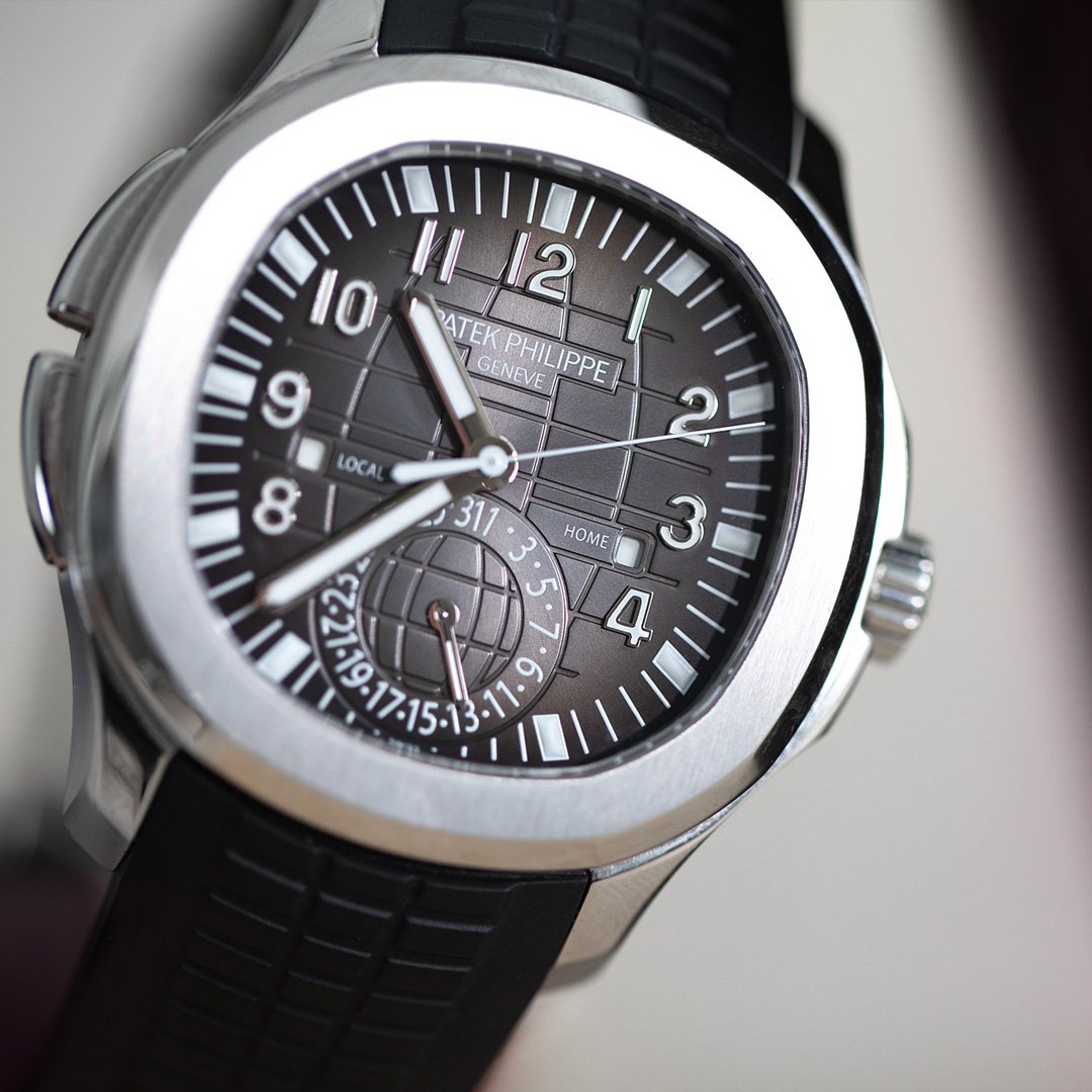 Crafted with a 40.8 mm stainless steel case, the watch strikes an ideal balance between robustness and elegance. The embossed black dial, featuring a unique globe design, offers an exquisite backdrop for the dual time display. The dial’s luminescent hands and numerals ensure legibility in all conditions, a hallmark of the Aquanaut series’ focus on utility and style.The watch’s standout feature is its dual time function, displayed through two hour hands and a day/night indicator for local and home time, making it an indispensable tool for world travelers. This functionality is powered by Patek Philippe’s in-house caliber 324 S C FUS, renowned for its precision and reliability.