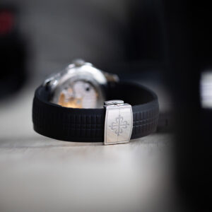 This Patek Philippe Aquanaut 5164, crafted in 2015, presents itself in a remarkable state, showcasing the fine balance between luxury and practicality inherent in its design. The timepiece bears subtle signs of usage, reflecting a history of discerning wear. These light traces, most notably on the bezel ring, are minimal and do not undermine the watch’s sophisticated allure. Additionally, the clasp exhibits faint indications of use, yet these are superficial and do not compromise the overall integrity of the watch.