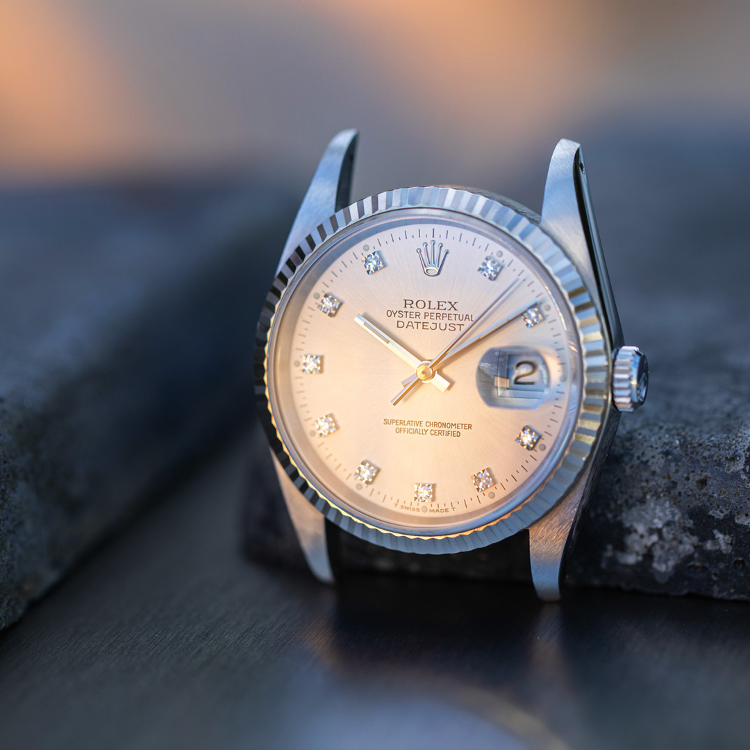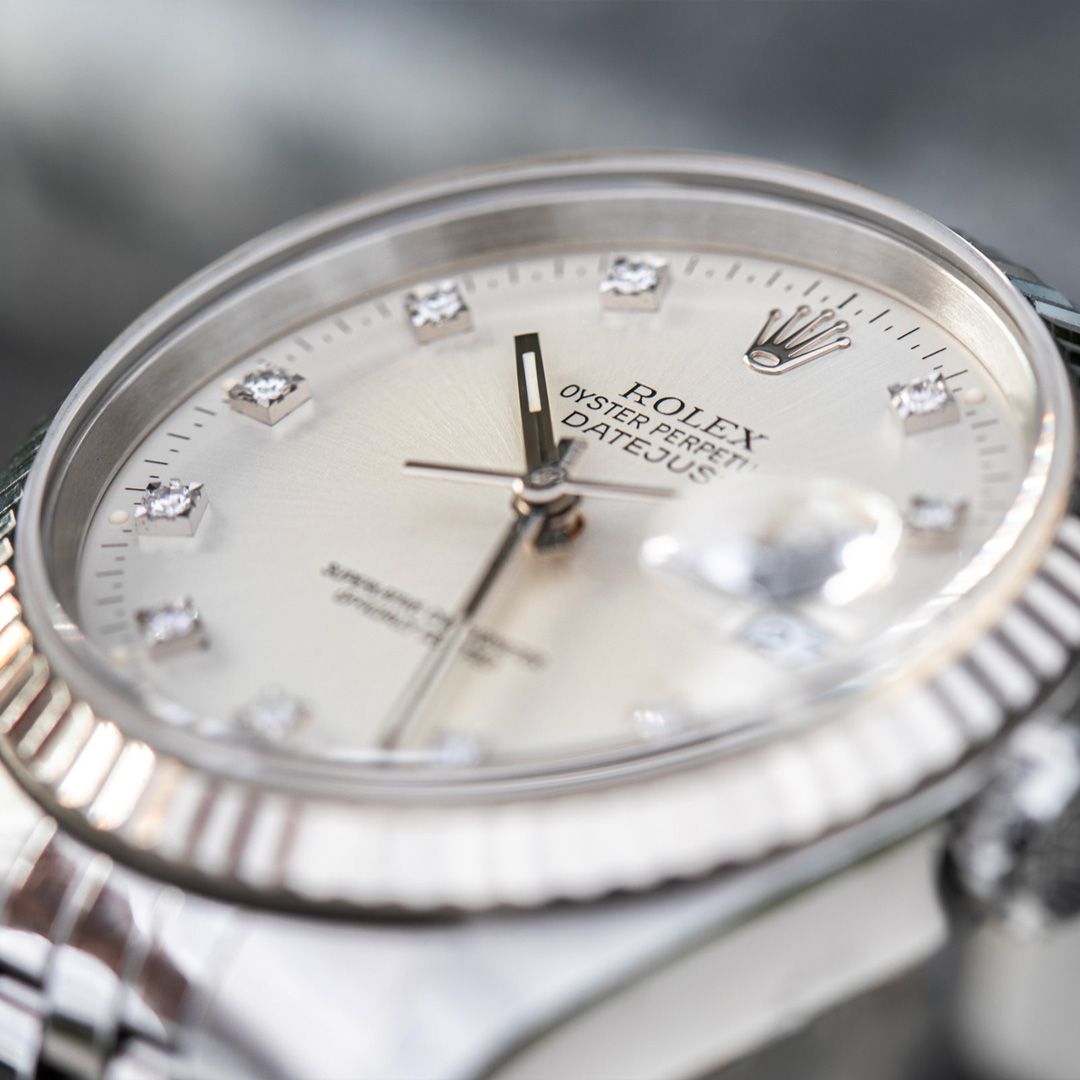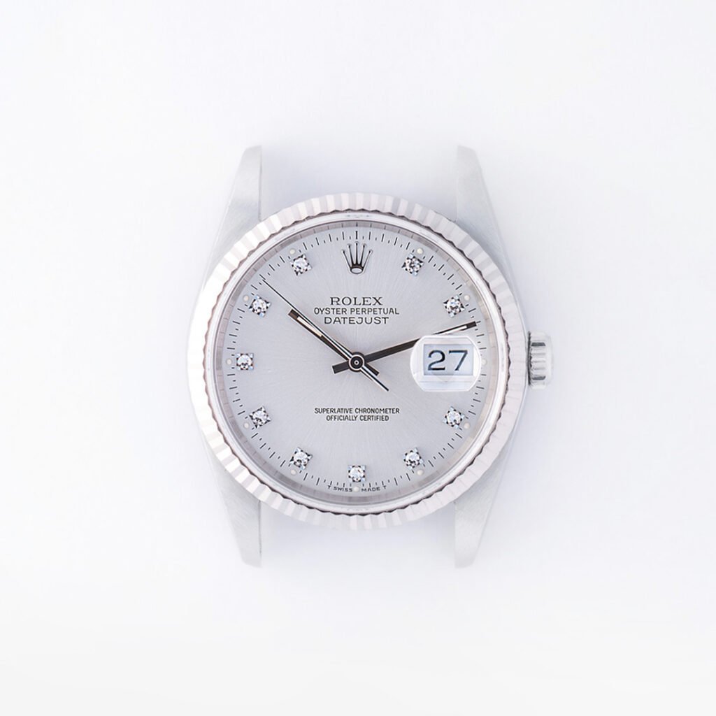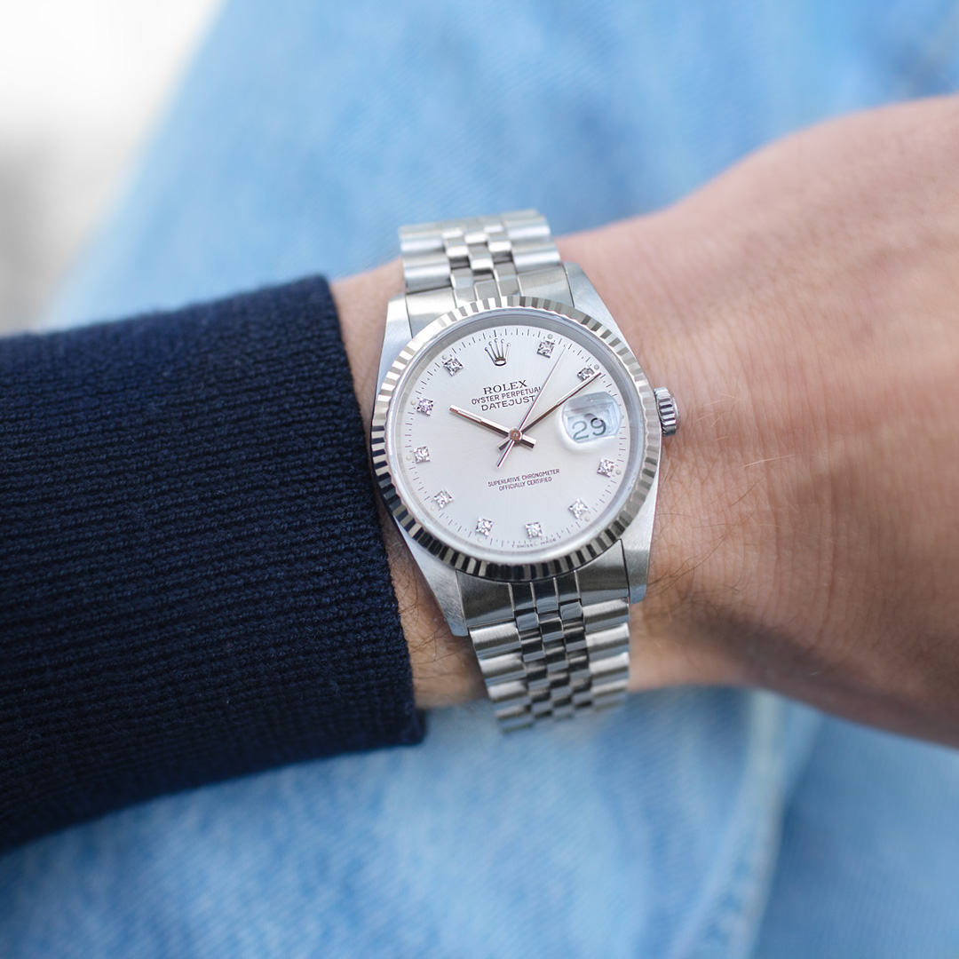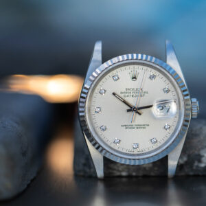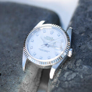 This Rolex Datejust 16234, originating from the late 1980s to early 1990s, not only exhibits a commendable condition that narrates its well-cherished history but also boasts an elegance elevated by diamond-set hour markers, adding a touch of opulence to its classic demeanor. Despite bearing minimal traces of wear, the watch retains an exceptional aesthetic appeal, with its casing remaining sharp and refined. These marks of usage are subtle and evenly distributed, suggesting a history of respectful and discerning wear, without detracting from the timepiece’s distinguished charm.